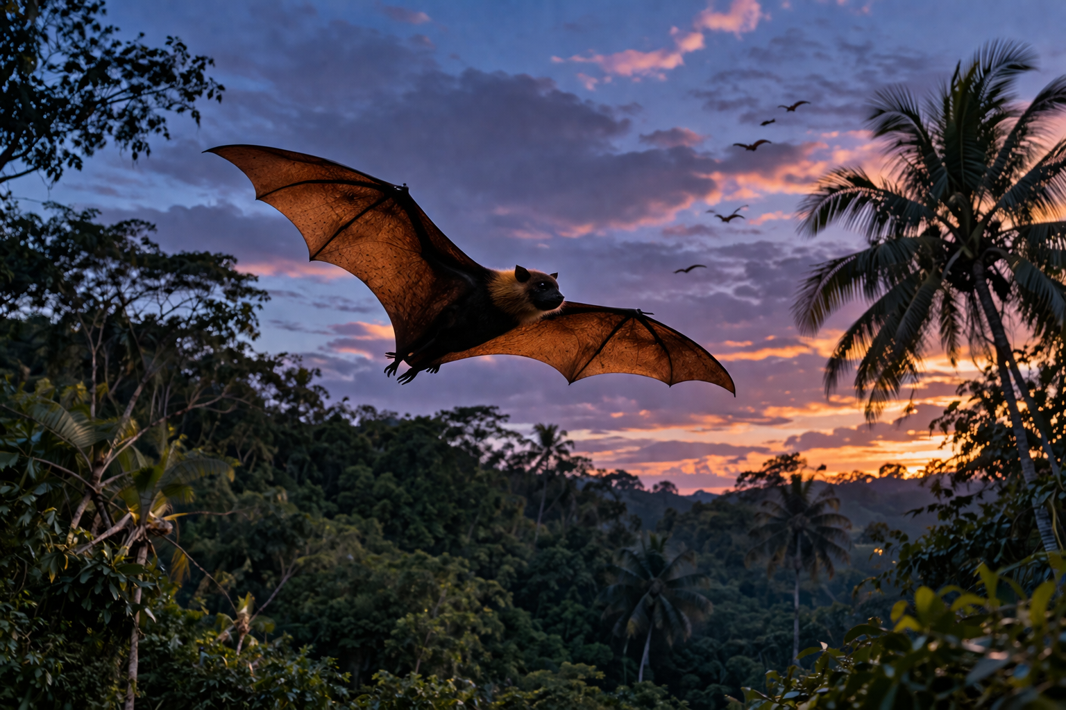 Contrairement aux petites chauves-souris insectivores, la roussette n’utilise pas l’écholocation. Elle se repère grâce à sa vue très développée et à son odorat puissant — deux sens qui lui permettent de localiser les arbres fruitiers à grande distance.