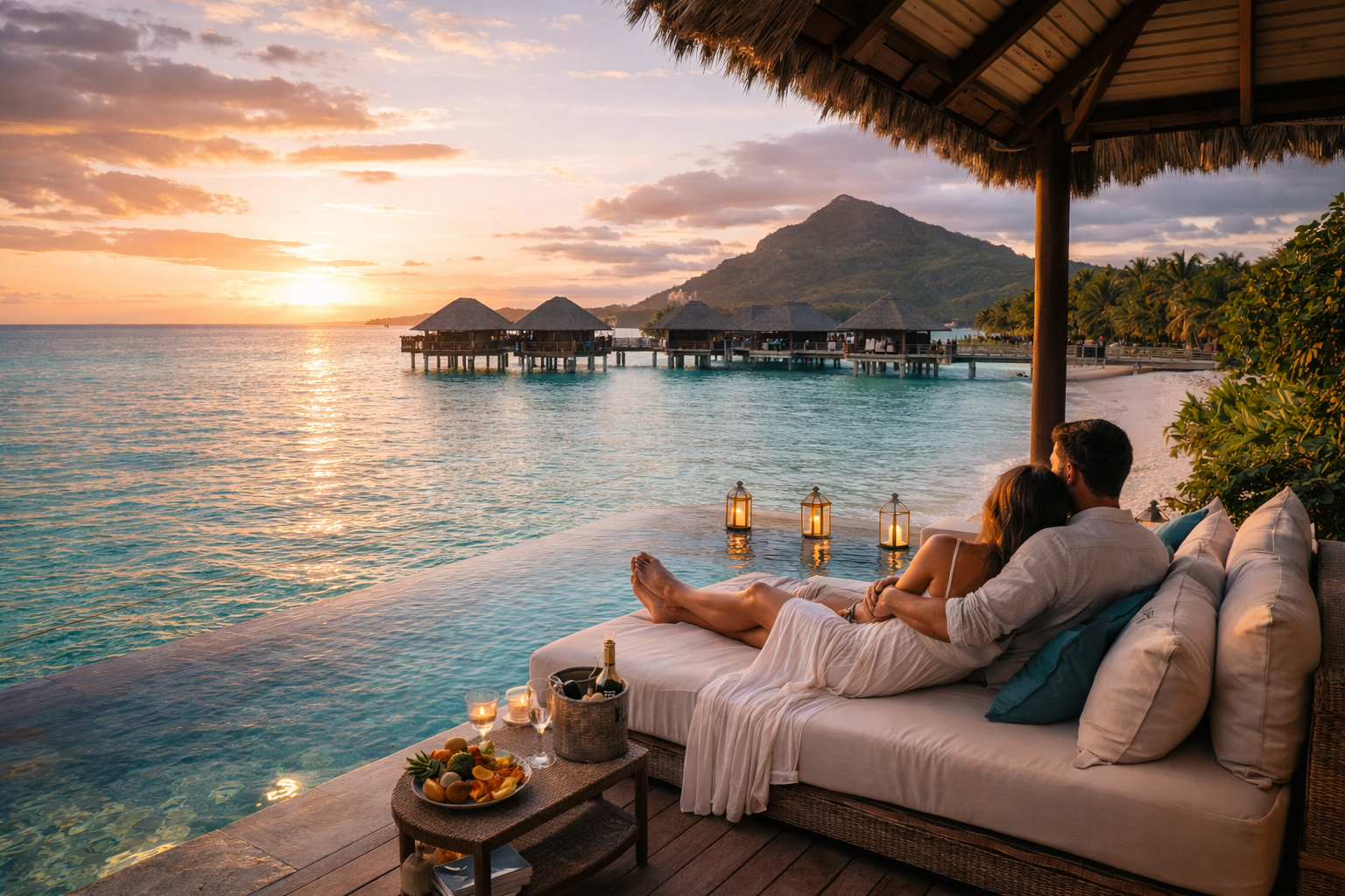 Ce qui le différencie vraiment : l’atmosphère. Pas de familles avec enfants, pas d’animations bruyantes, pas de sensation de se perdre dans un grand resort. Les love nests — grands lits de plage sous les lataniers face aux îles du nord — sont presque devenus iconiques. Le spa Cinq Mondes propose un kiosque dédié aux massages en duo surplombant le lagon. Le programme « You & Me Moments » propose des expériences exclusivement conçues pour les couples : nuit étoilée, coucher de soleil en catamaran, escapade en pirogue, dîner aux chandelles sur la plage.